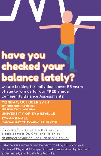 The second year DPT students will be conducting community balance assessments as part of the PT 623 course. Please share this opportunity with anyone you think might be interested and able to participate. The participant does not need to be able to walk, but should at least be able to stand for the assessments. Who: We are looking for 24 participants who are 55 years or older to take part in balance assessments. When: 10/27/2025 Where: University of Evansville Eykamp Hall 1800 Walnut Street Evansville, IN 47714 What: DPT students will complete balance testing and provide you with an exercise program and education to address any findings during the testing Time: Session 1 from 1:00-2:30 Session 2 from 2:30-4:00 Participants can contact me by email ck39@evansville.edu to seek further information or click here to sign up online |
