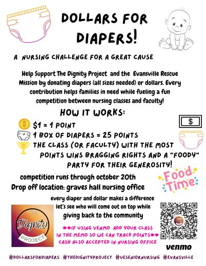 Help support The Dignity Project and the Evansville Rescue Mission by donating diapers (all sizes needed) or dollars. Every contribution helps families in need while fueling a fun competition between nursing classes and faculty!