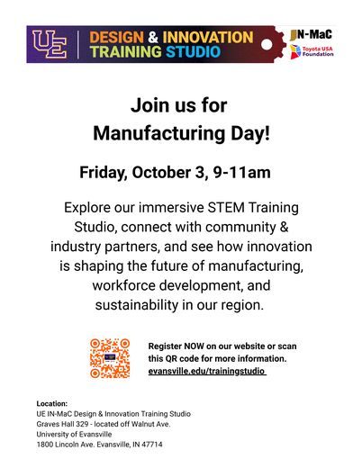 Driving Possibilties welcomes you to Graves Hall 329 on Friday 10/3 from 9am - 11am to celebrate Manufacturing Day at our one-of-a-kind UE IN-MaC Design and Innovation Training Studio!