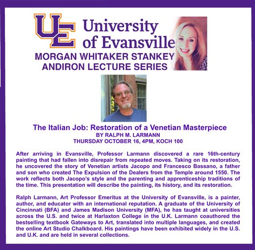 After discovering a rare 16th century painting, shortly after arriving in Evansville, Professor Larmann watched as the work fell into disrepair after being moved from place to place. After seeing the surface of work punctured in multiple locations and suffering from other damage, Larmann took it upon himself to restore the work. In doing so, he discovered the story of a family of artists who lived in Venice, the unique parenting skills and apprenticeship process of the time, and a 500 year journey from Italy to Evansville. The artists, Jacopo and Francesco Bassano, worked together as father and son to create the work The Expulsion of the Dealers from the Temple. Created about 1550, it was a good representation of the work of Jacopo Bassano, but also tells an interesting story about good parenting and teaching. This presentation will describe the work, its history, and the process used to restore the work.