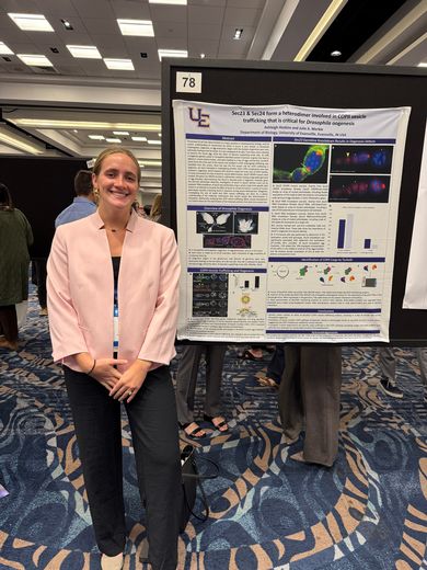 Ashleigh's research, titled "Sec23 & Sec24 form a heterodimer involved in COPII vesicle trafficking that is critical for Drosophila oogenesis," is supported by an S-STEM grant from NSF. Ashleigh is completing a certificate in CiSM (Computers in Science and Math) at UE and conducts research with faculty mentor Dr. Julie Merkle (Department of Biology). |