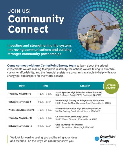 CenterPoint Energy is inviting customers to join upcoming Community Connects events beginning Thursday, November 6. These gatherings will be held across southwestern Indiana and are a great opportunity to connect directly with CenterPoint’s local team.