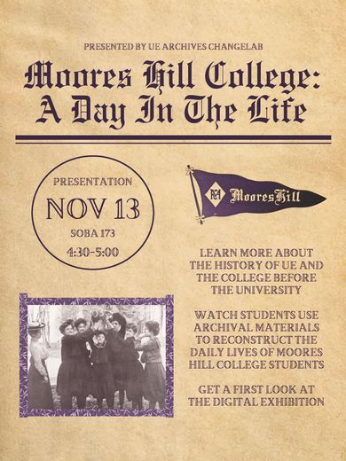 Hear about a "day in the life" of two actual students at Moores Hill college, reconstructed by students in the "Future of UE's Archives" ChangeLab! Don't miss this unique opportunity to hear about student life at Moores Hill.