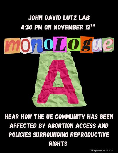 Join the Reproductive Rights Change-Lab, UEIPCA, and The Menstrul Equity Club in the John David Lutz Theatre Lab at 4:30 P.M. TODAY for MONOLOGUE A: a performance to amplify stories from our community about how reproductive rights policies shape real lives.