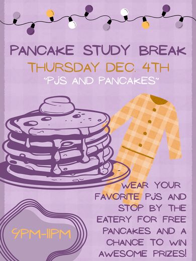 The Fall 2025 Pancake Study Break will be held on Reading/Study Day - Thursday, December 4 from 9 p.m. to 11 p.m. at The Eatery in Ridgway University Center.